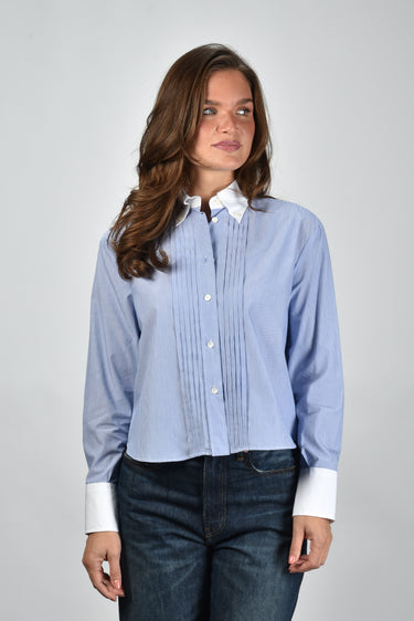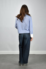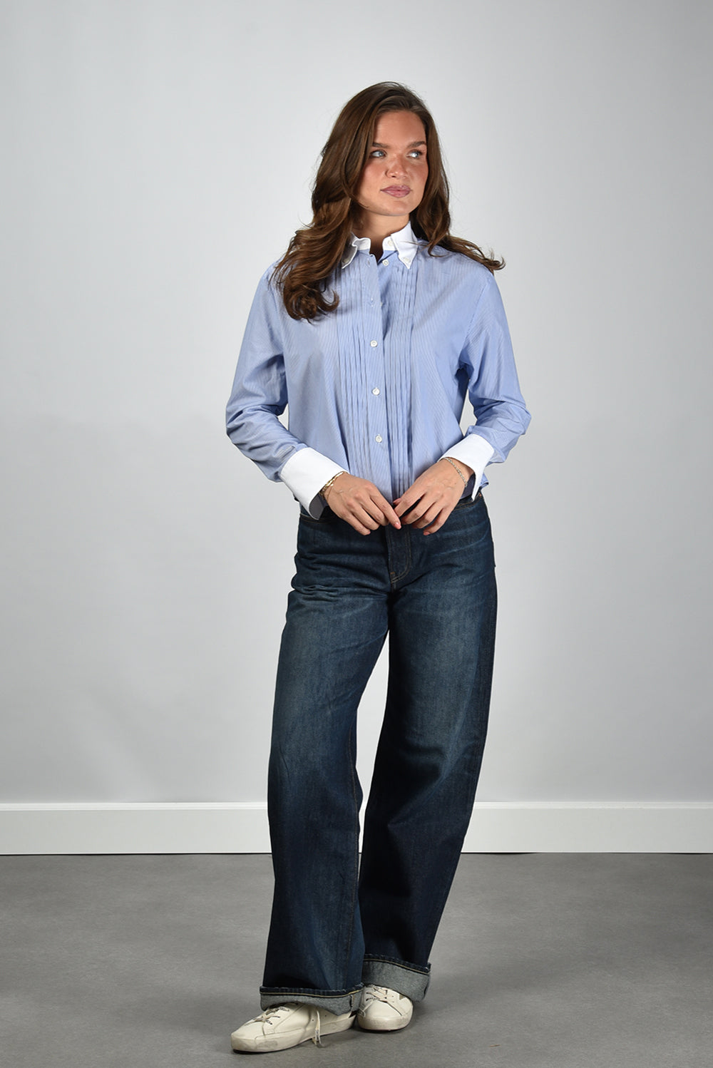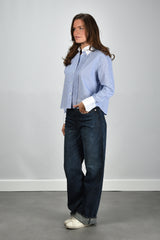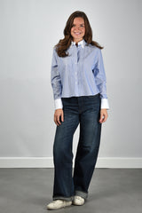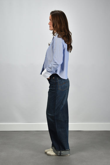 Behold the Academia blouse Miuccia blue, a refined choice for any wardrobe. Made of 100% cotton and executed in Riga Azzurra color. This product has a regular fit and is suitable for machine wash at 30°. Model Lise wears size 38/M/28 and is 1.73m tall. Article number: 1069B-643-Riga Azzurra.