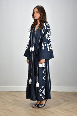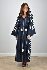 Here you can see the Sage & Ivy dress Lika in navy/white, made of 100% linen. This elegant dress offers a regular fit and is ideal for various occasions. The model wears size M and is 1.73m tall. Dry cleaning recommended. Article number: LIKA-Navy/White.