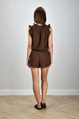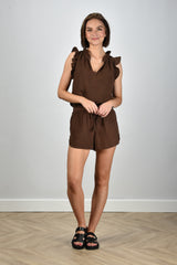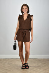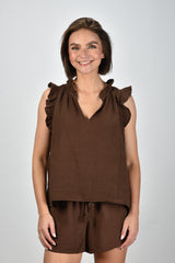 Xirena mouwloze top Bex met v-hals en volantmouwen bruin