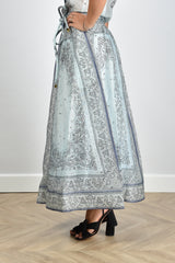 Beautiful skirt by Zimmermann, model Matchmaker, in the color blue bandana. The skirt has a belt, so you can easily adjust it to fit. Combine this beautiful skirt with the matching blouse by Zimmermann and sandals by Loeffler Randall for the complete look of the photo. This skirt has a normal fit. Model is 1.73m, is size M and wears size AUS2 (M).
