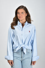 Mooie blouse van het merk Ami Paris blouse, model Boxy Fit, in de kleur sky blue. Deze blouse heeft een boxy pasvorm, wat betekent dat het een losser, ruimer silhouet heeft, wat zorgt voor comfort en een moderne uitstraling. Of je nu op zoek bent naar een elegante outfit voor op kantoor of een chique look voor een avondje uit, deze Ami Paris blouse biedt talloze mogelijkheden om je persoonlijke stijl te tonen. Model is 1,73 m, heeft maat M en draagt maat S.