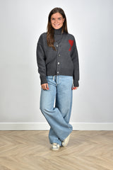 Vest van Ami Paris, model Red ADC BFUKC006.018, in het heather grey met het kenmerkende hartje in het rood. Het vest is voor 100% gemaakt van wol, waardoor hij super warm is én ook nog eens lekker zit. Het vest heeft een v-hals en een knoopsluiting. Het vest valt normaal. Model is 1,73m, heeft maat M en draagt maat M.
