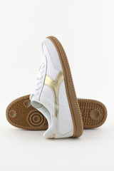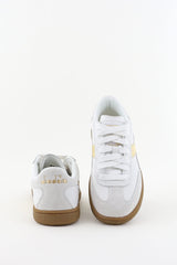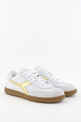 Zie hier de Diadora Heritage sneakers Trainer Dore in wit/goud. Deze luxe sneakers combineren leer en suède voor een verfijnde uitstraling. Let op: ze vallen één maat kleiner dan gebruikelijk. Onderhoud met Carbonpro voor langdurige kwaliteit. Artikelnummer: 501.182420