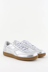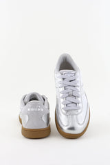 Zie hier de Diadora Heritage sneakers Trainer Metallic zilver, vervaardigd uit metallic leer en suède. Deze stijlvolle schoenen bieden een uitneembaar voetbed voor optimaal comfort. Let op: ze vallen één maat kleiner; bestel daarom een maat groter. Artikelnummer: 501.181987-90001-Silver Metalized.