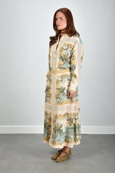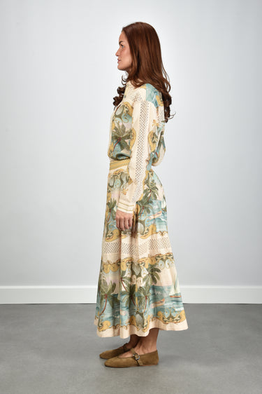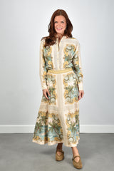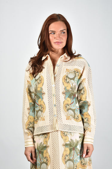 De blouse met knoopsluiting multicolour van Farm Rio valt direct op door haar tropische patroon. Denk aan schelpen en palmbomen in rijke tinten royal sea multicolor. De klassieke kraag en lange mouwen geven een rustige basis aan het levendige ontwerp. Langs de knoopsluiting loopt een sierlijke rand met subtiele contrastkleuren die het geheel afmaken. De mix van linnen en viscose voelt licht en luchtig aan, ideaal voor warme dagen. Combineer deze blouse met de Farm Rio rok 349108 royal sea multicolor voor een uitgesproken zomerse set. De blouse valt normaal op maat, dus je kunt gerust je eigen maat kiezen.