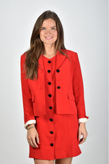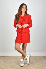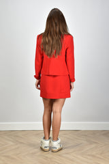 De blazer van Ganni, model F9390 in het de kleur barbados cherry of wel rood, heeft een klassiekere uitstraling, vanwege de knopen en de kraag. Combineer deze mooie blazer met de bijbehorende broek van Ganni of de rode jurk van Ganni voor een complete set. Stijl af met de Skystar sneakers van Golden Goose om de look casual en stoer te maken. Model is 1,73m, heeft maat 38 en draagt maat 38.