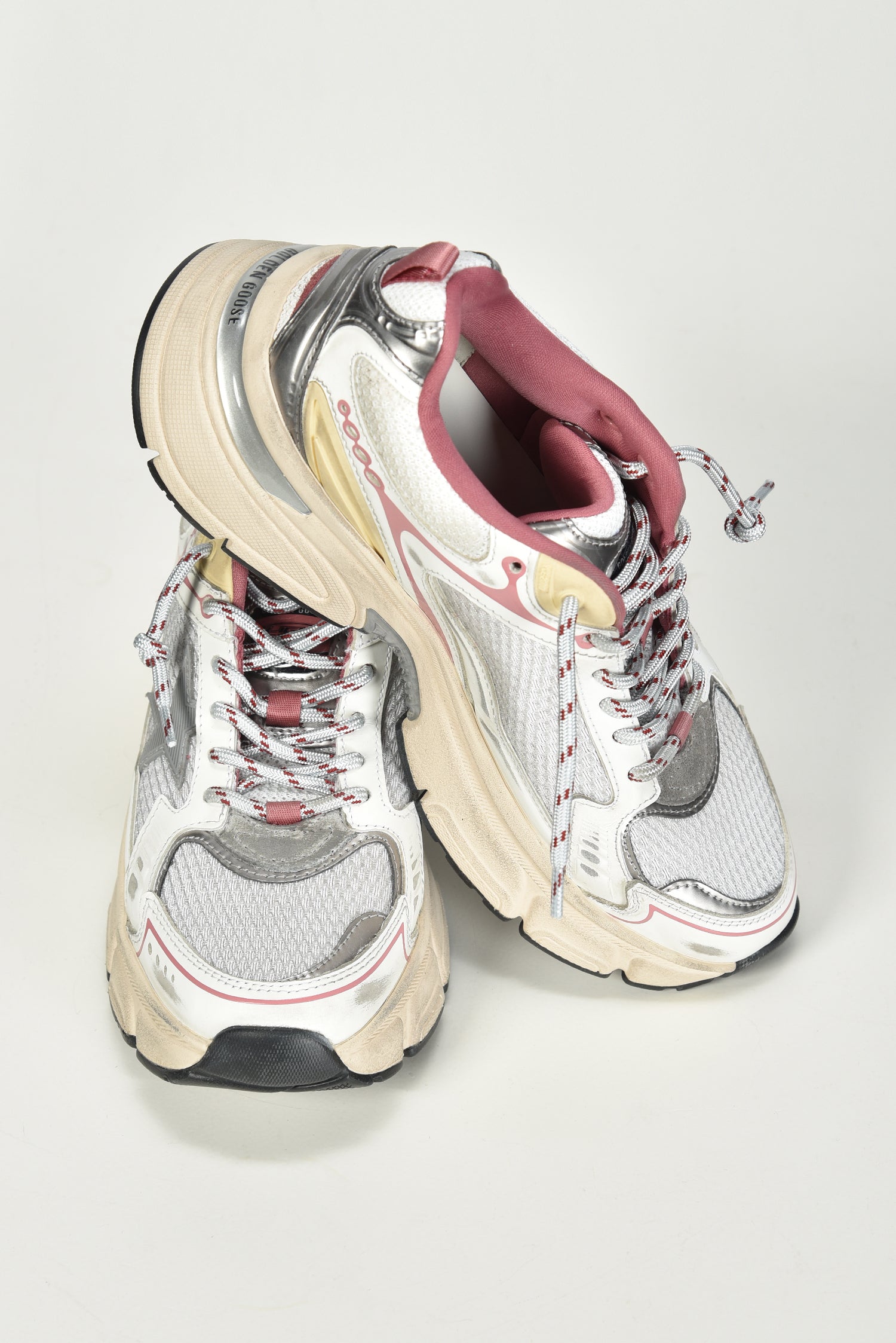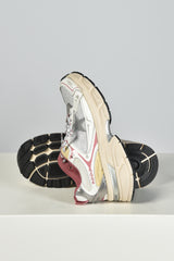 De sneakers Lightstar in zilver met witte en rode details van Golden Goose trekken direct de aandacht door hun gelaagde zool en opvallende ster aan de zijkant. Het bovenwerk van leer en zilverkleurig mesh voelt stevig en licht tegelijk. De gestreepte veters geven een speels accent. Elke schoen is handgemaakt, waardoor geen paar helemaal gelijk is. De normale pasvorm zorgt dat ze prettig zitten, zowel bij jeans als bij een losse pantalon. Wil je variatie in je collectie, kijk dan ook eens naar de Golden Goose sneakers Lightstar grey/silver/black.