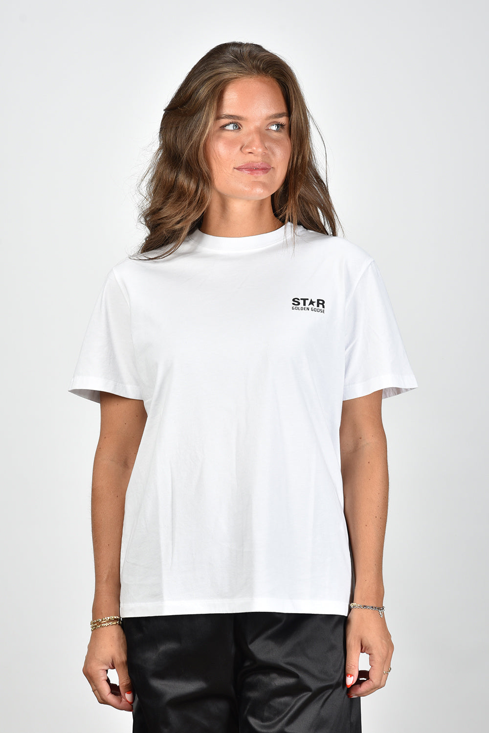 Bekijk hier het Golden Goose t-shirt wit, een elegant en veelzijdig kledingstuk. Gemaakt van 100% katoen voor optimaal comfort. Dit product heeft een normale pasvorm en is geschikt voor dagelijks gebruik. Lise draagt maat 38/M/28 en is 1,73m lang. Wasvoorschrift: 30°. Artikelnummer: GWP01220.P000879.10283-White/Black.
