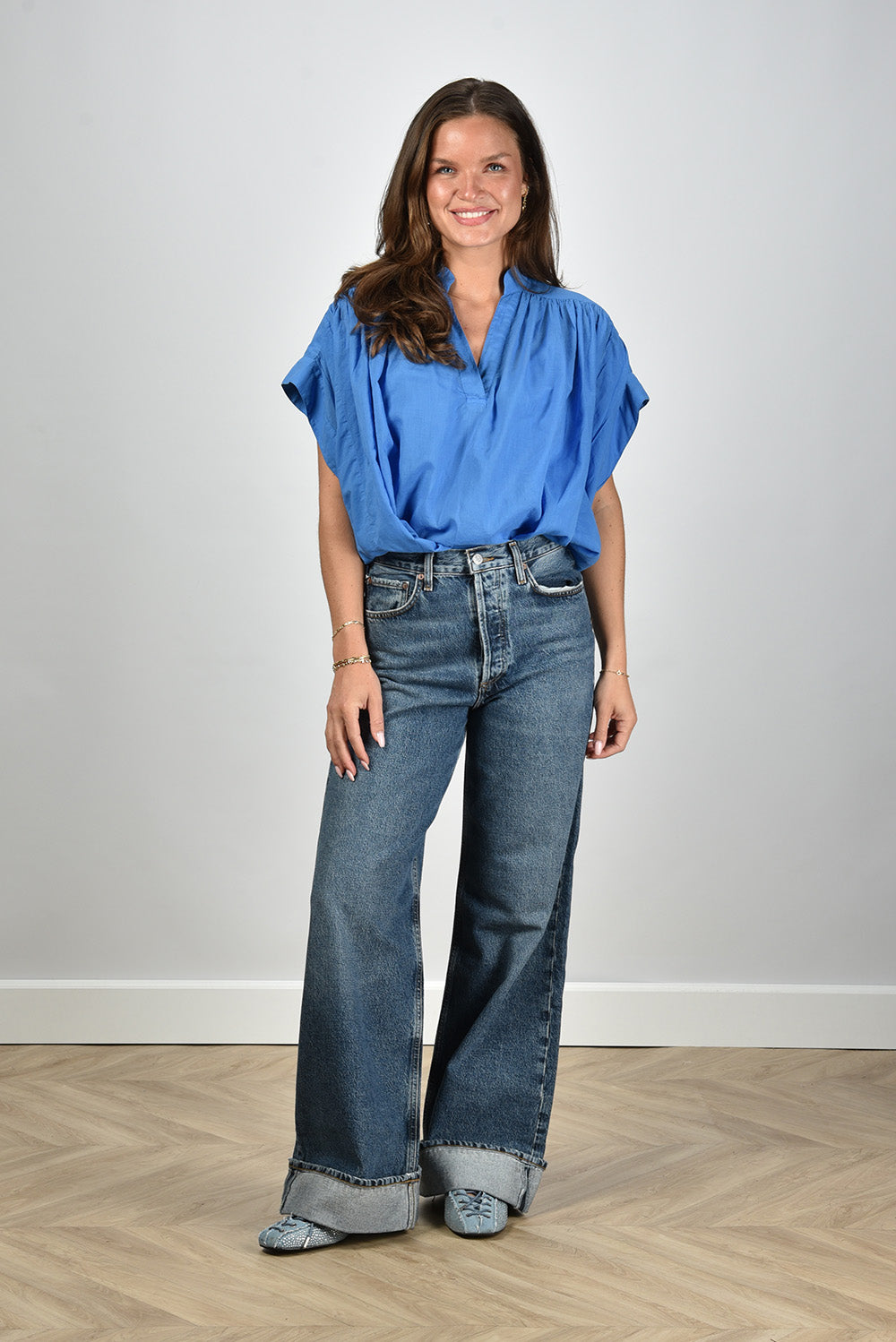 Greek Archaic Kori blouse met korte mouwen en v-hals blauw