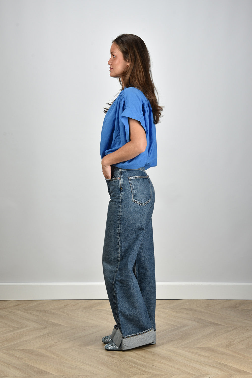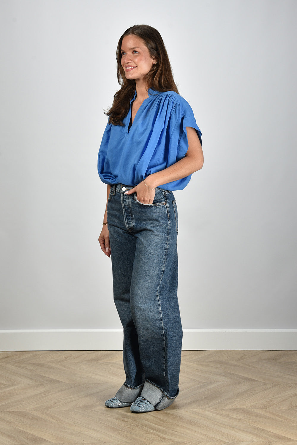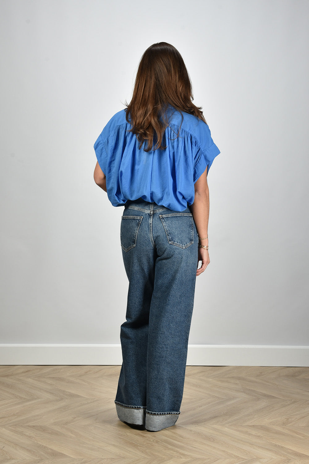 Ons model Lise is 1,73m en Lise heeft maat 38/M/28. deze blouse valt normaal op maat