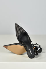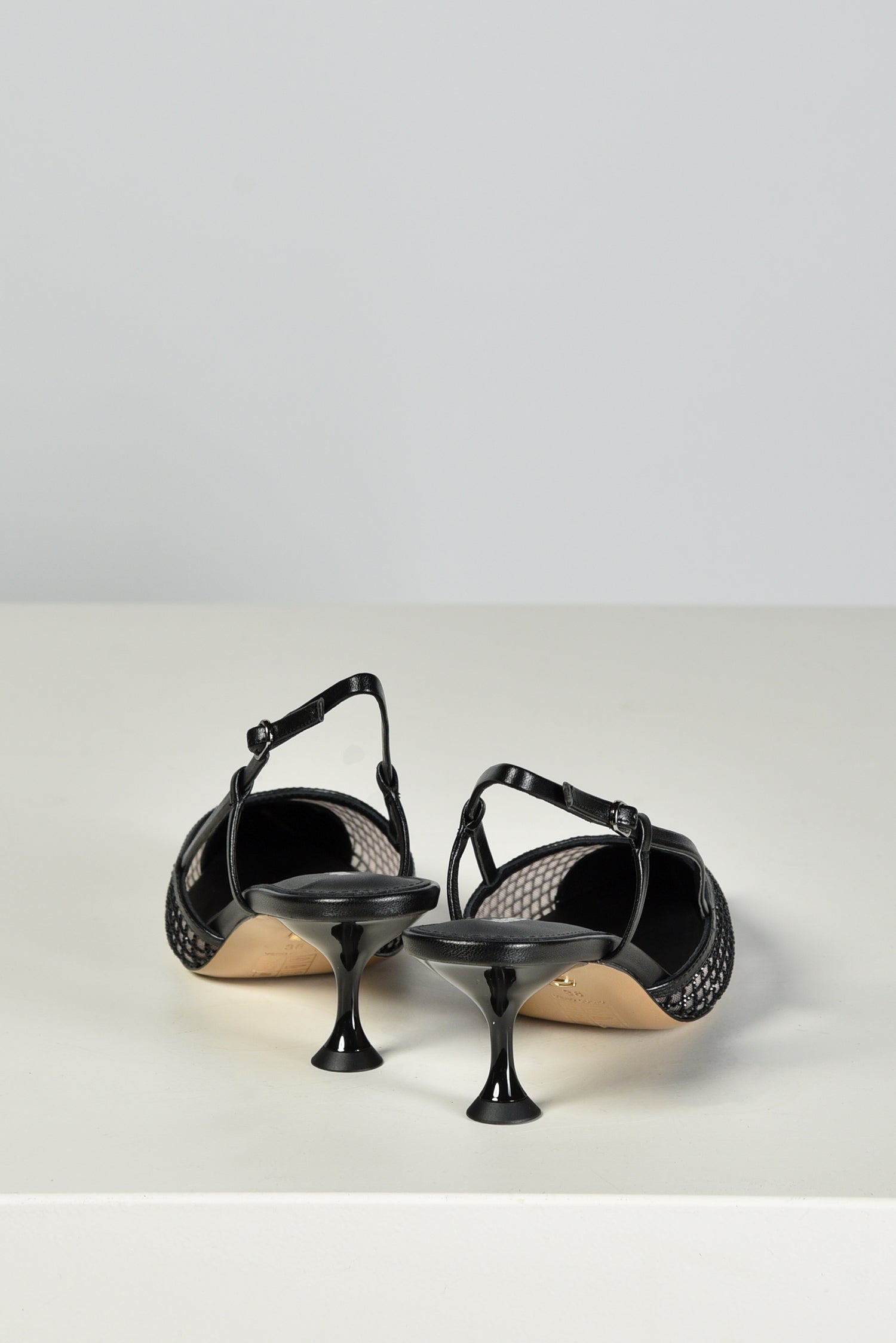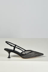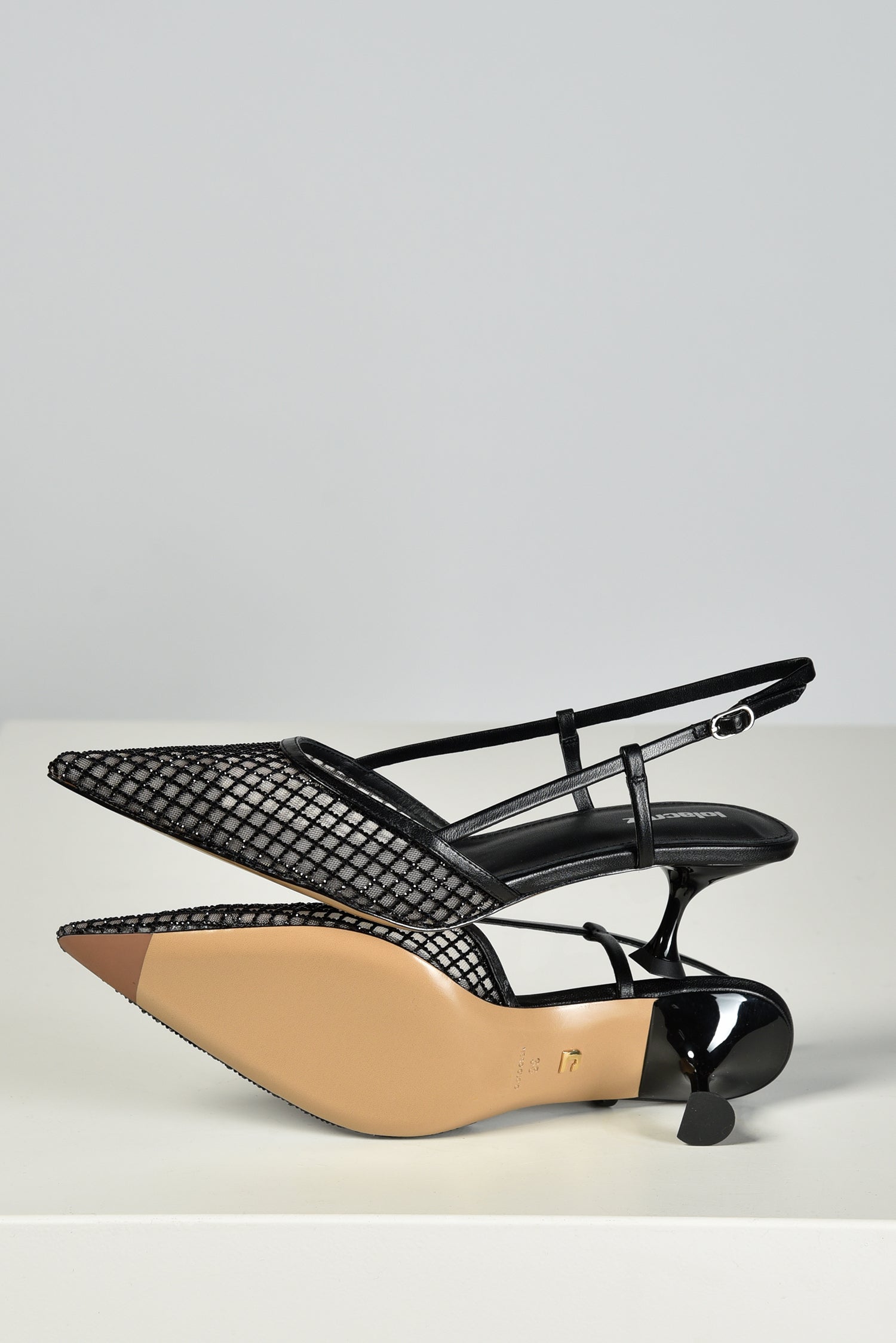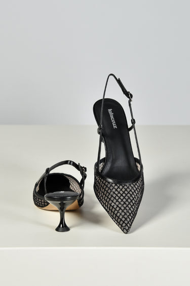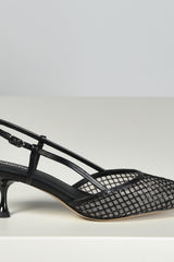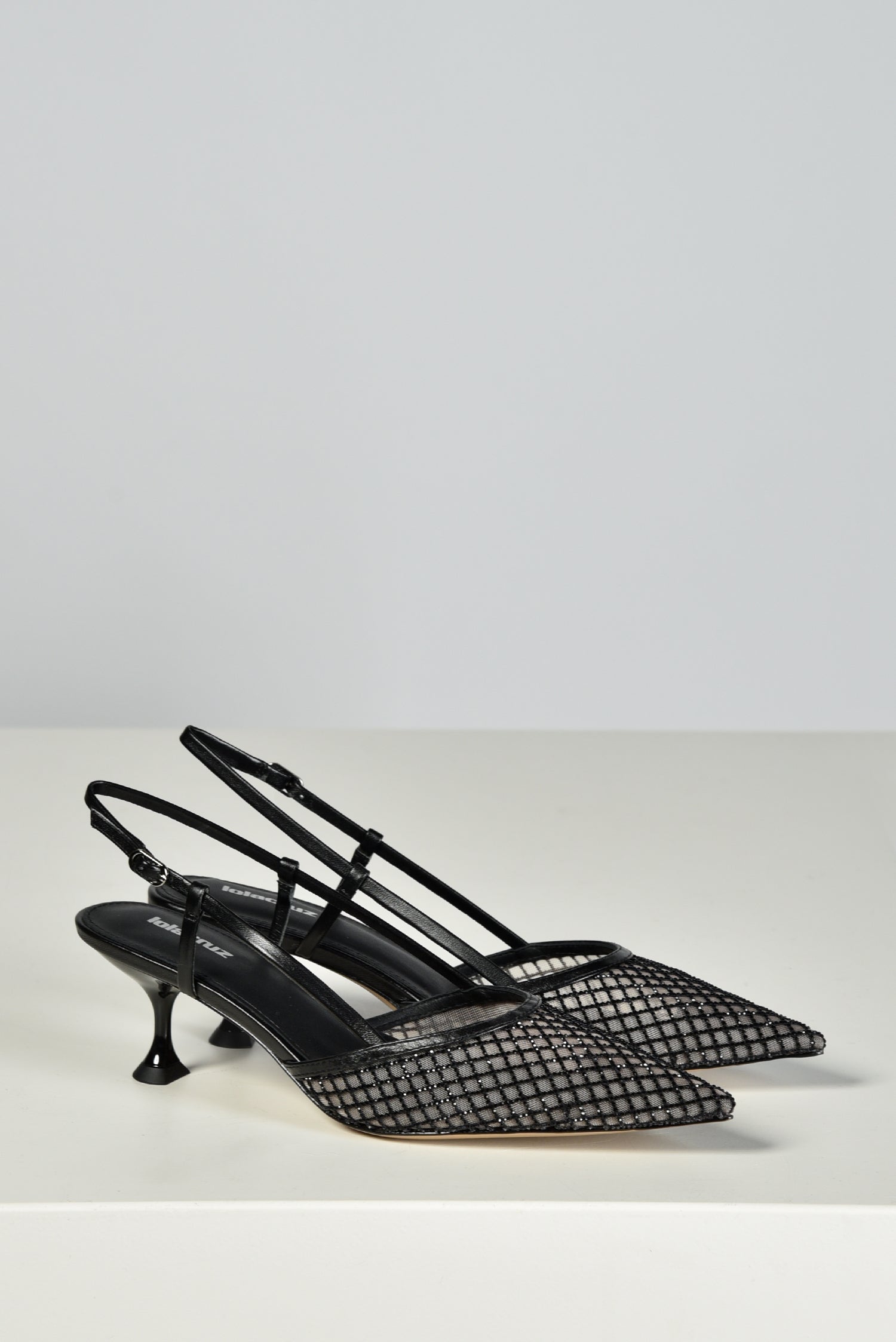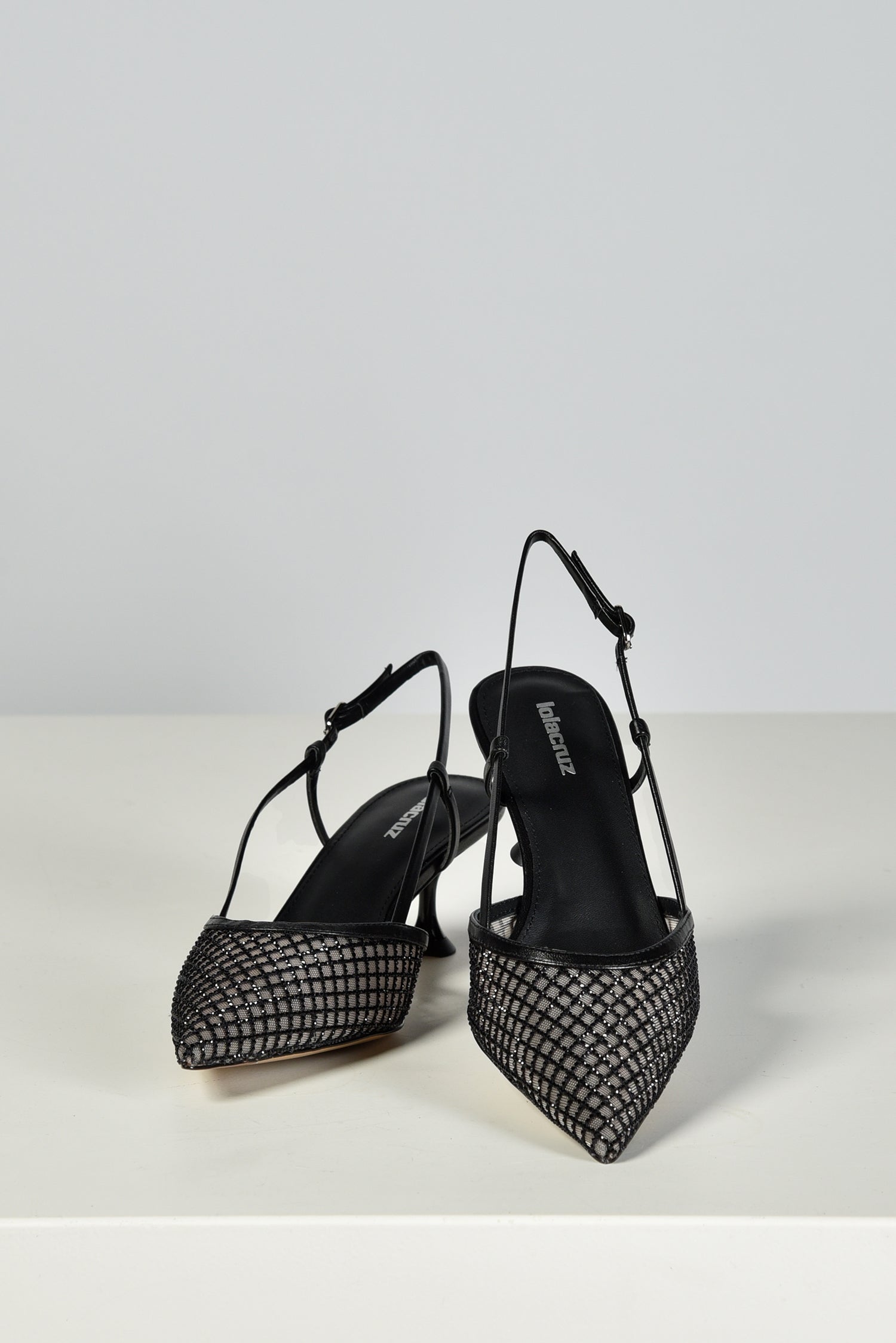 Dit zijn de sandalen van Lola Cruz met mesh en strassteentjes in zwart, een slingback met een puntige neus en een strak rasterpatroon. Het mesh houdt de voorvoet luchtig en laat de steentjes duidelijk uitkomen. De slanke trechterhak voelt licht aan en geeft de sandaal een elegante lijn. De dunne enkelband met gesp sluit netjes aan. Ze vallen normaal op maat. Het leer en textiel zijn zorgvuldig afgewerkt, precies zoals je dat van het Spaanse label mag verwachten, met aandacht voor vorm en detail.