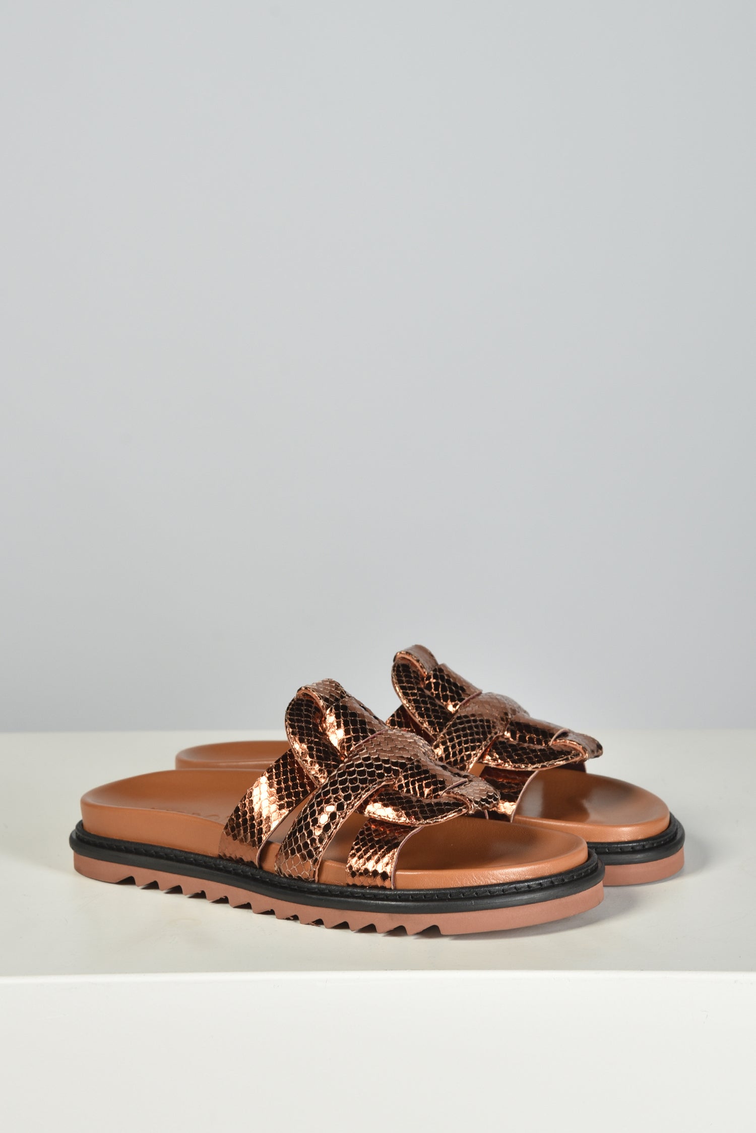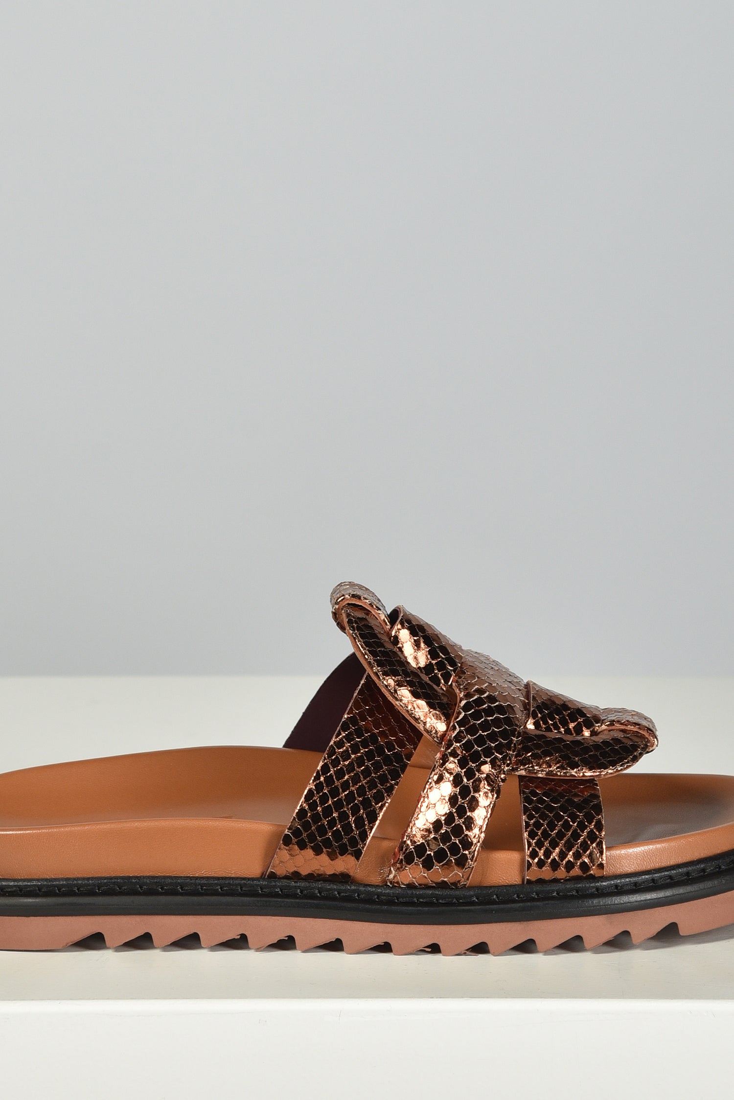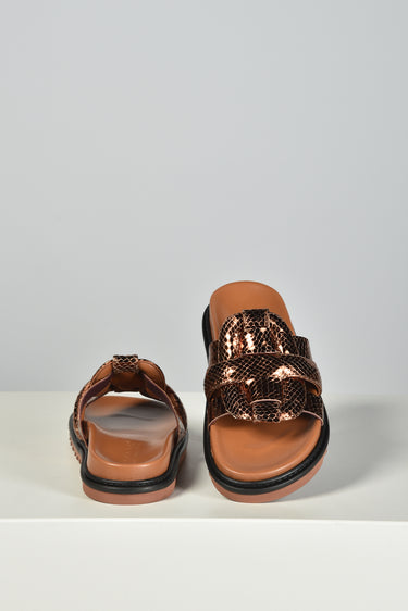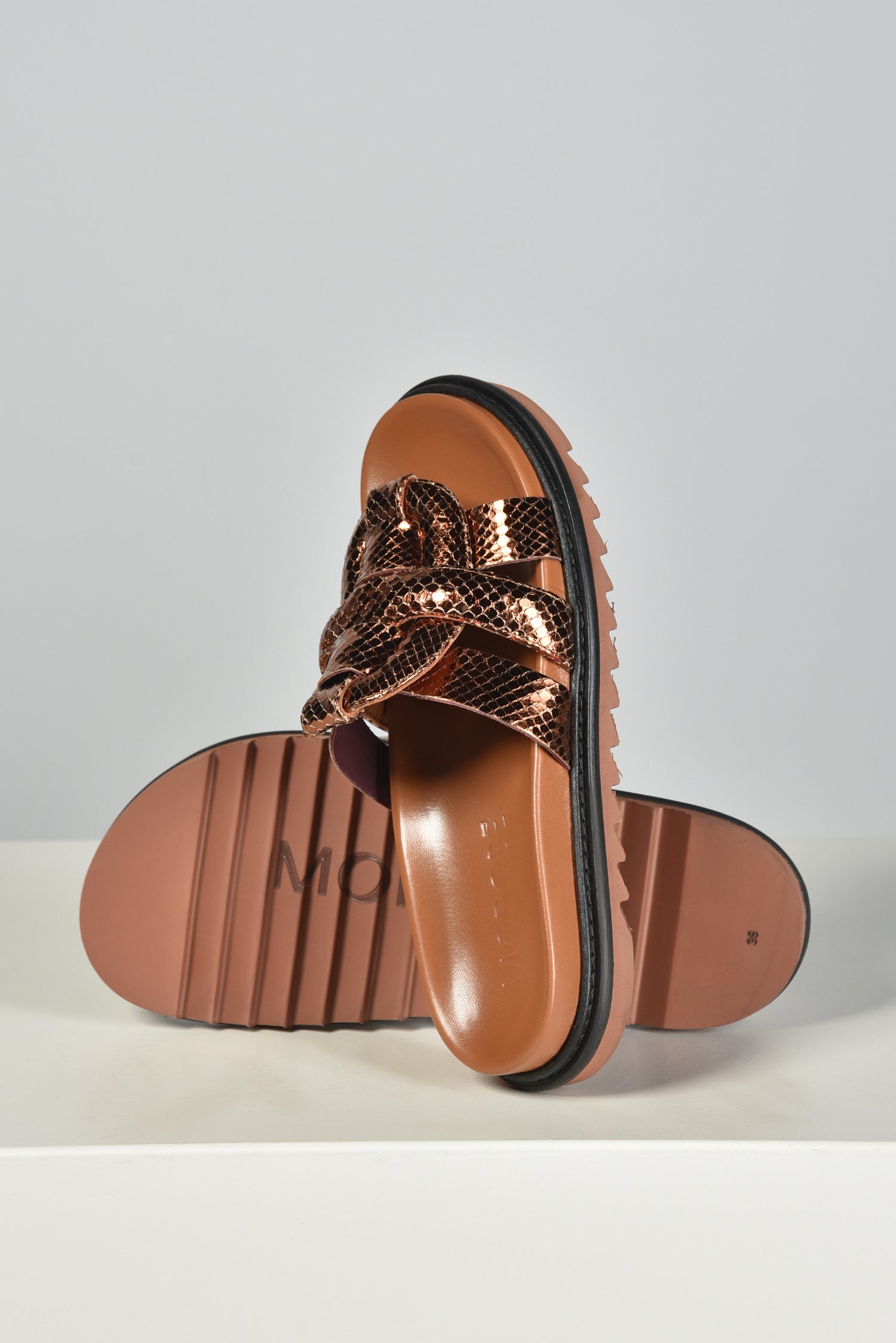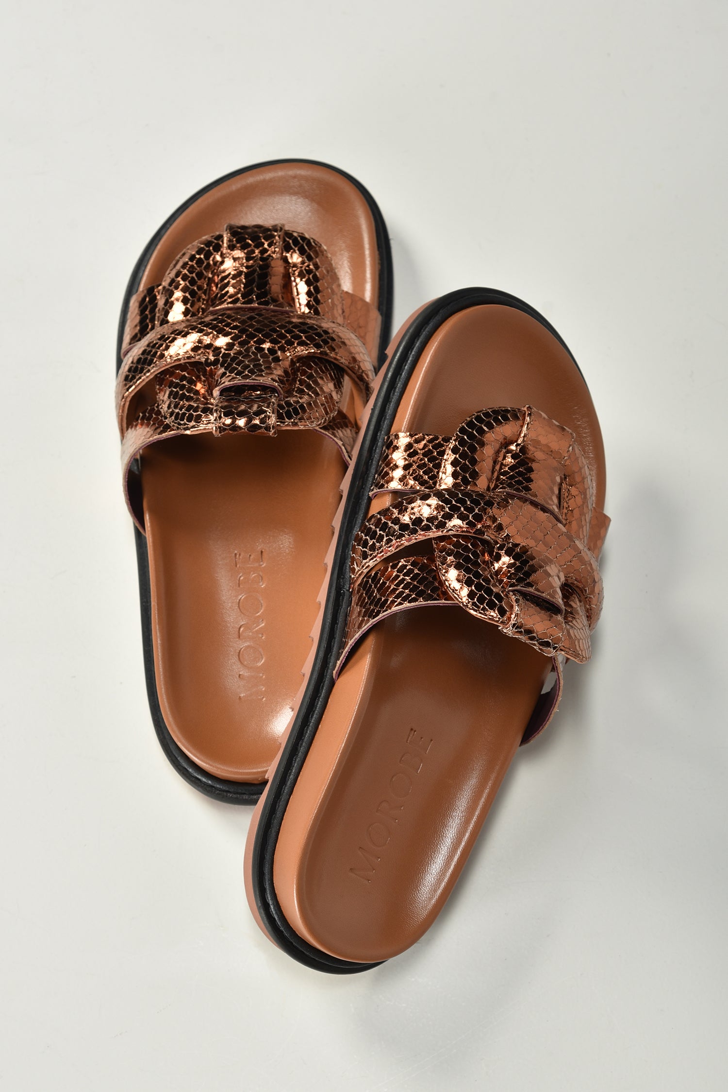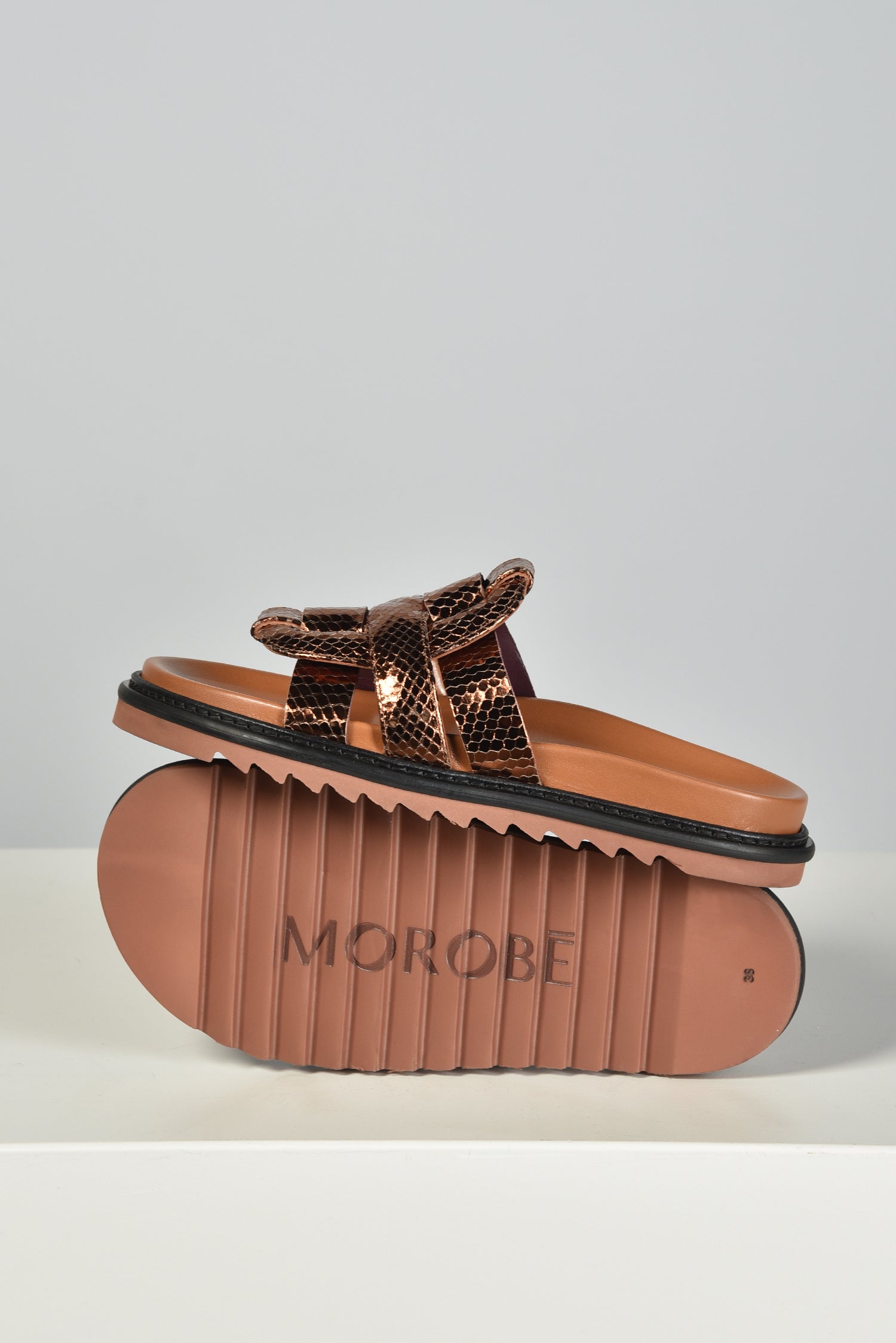 De sandalen Emilia brons van Morobe trekken direct de aandacht met hun metallic leren bovenwerk in een subtiel slangenpatroon. De glanzende bronstint vangt het licht op een elegante manier, terwijl de kruislingse banden zorgen voor een luchtige, moderne look. De zwarte geribbelde zool geeft een mooi contrast en extra stevigheid onder de voet. Het leer voelt soepel aan en vormt zich prettig om de voet. Deze sandalen vallen normaal op maat. Morobe combineert bij dit ontwerp vakmanschap met een artistieke signatuur die typisch is voor het Antwerpse label. Draag ze bij de Morobe sandalen Emilia 60 chocolat voor een speelse variatie in kleur en hoogte.