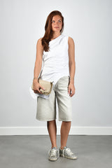 Ik laat je graag de sleeveless top one shoulder wit van RÓHE zien. De asymmetrische vorm trekt direct de aandacht, met een omgekeerde overhemdkraag die strak en helder staat in het optic white. De stof is gemaakt van 100 procent katoen en voelt licht en stevig tegelijk. De onopvallende ritssluiting sluit mooi aan zonder zichtbare randen. De top volgt je lijn zonder te strak te zitten. Hij valt normaal op maat, dus je kunt uitgaan van je eigen maat. RÓHE werkt met een duidelijke visie en een open manier van produceren, wat je merkt in de nette afwerking en het zorgvuldige ontwerp.