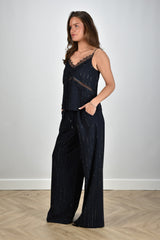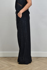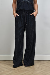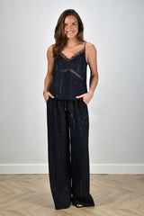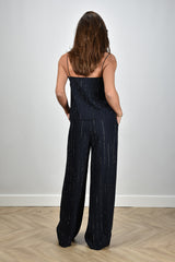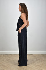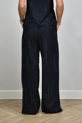Zie hier de Self Portrait broek blauw, een verfijnde keuze voor elke gelegenheid. Gemaakt van 64% polyester, 31% viscose en 5% elastane biedt deze broek comfort met een normale pasvorm. Perfect gestyled door Lise op 1,73m lengte. Kleur: navy. Artikelnummer: SS25-152P-N-Navy.