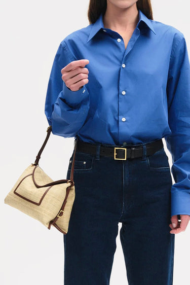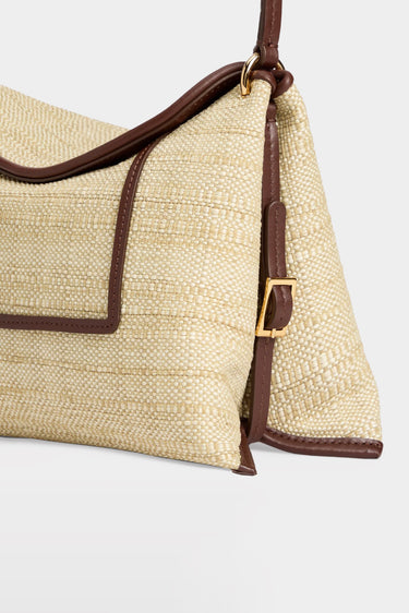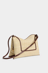 De crossbody Penelope Slouch in beige raffia van Wandler heeft de kenmerkende soepele vorm waar het model om bekendstaat. De combinatie van geweven raffia en glad kalfsleer geeft het ontwerp een rijk en zomers karakter. De flap met magnetische sluiting valt mooi over het rechthoekige silhouet en is afgewerkt met een fijne donkere bies langs de randen. De verstelbare, smalle schouderband zorgt dat je de tas op verschillende manieren kunt dragen. De gouden hardware voegt een subtiel glanzend accent toe. Ontworpen in Nederland en met de hand gemaakt in Italië, laat Wandler hier vakmanschap zien in elk detail. Ook verkrijgbaar als Wandler crossbody Penelope Slouch in saffron crust voor wie een warmere tint zoekt.