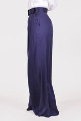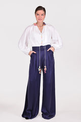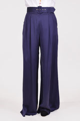 Prachtige broek van Zimmermann, Silk Wide Leg 5676PRHIG in de kleur navy. De broek is voorzien van een riem. En heeft wijd uitlopende pijpen. Combineer de broek met een mooie trui voor de koude winterdagen. Het model is 1,73m, heeft maat M en draagt maat 2.